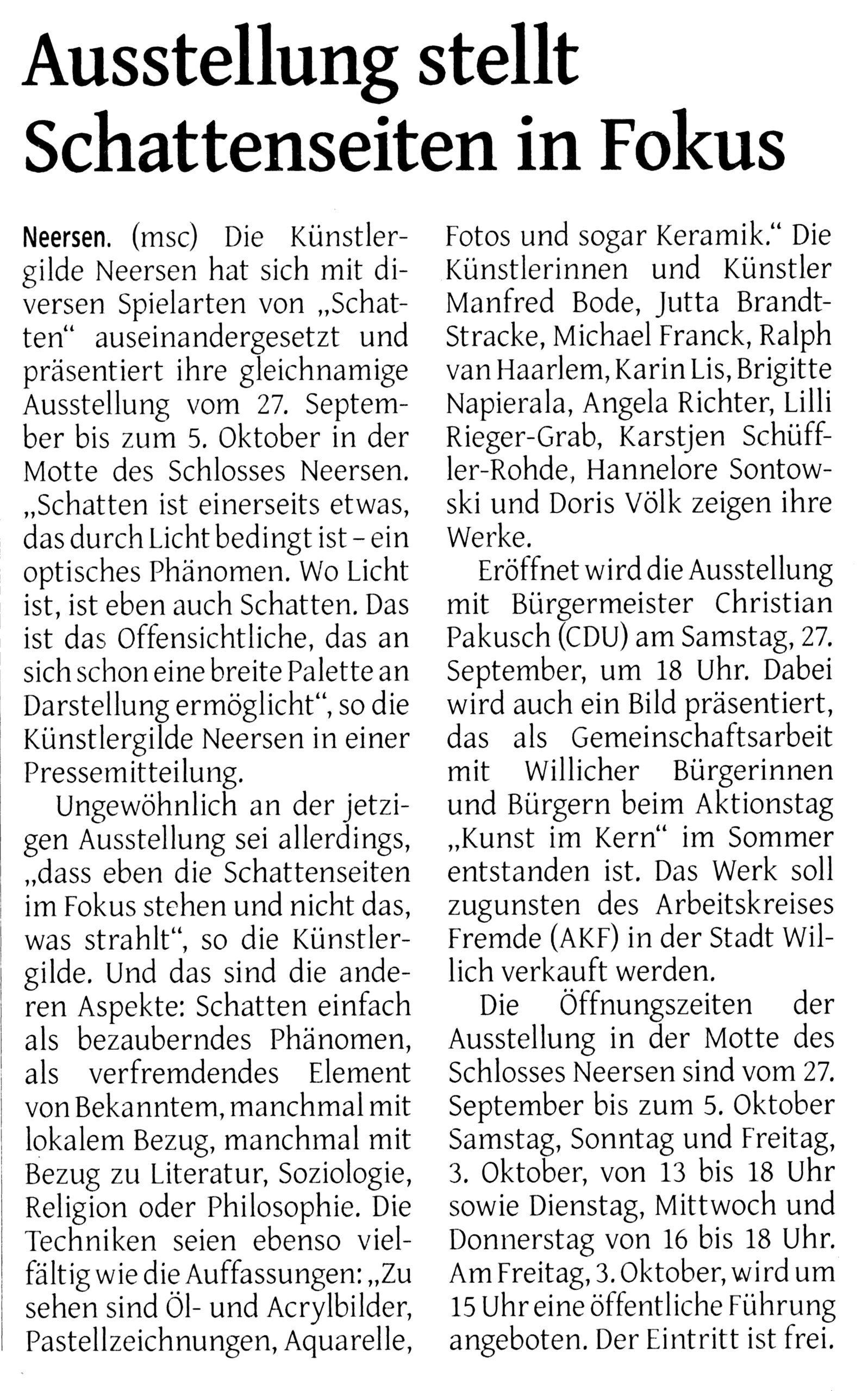 Neersen · Wo Licht ist, ist auch Schatten. Mit den Schattenseiten – und eben nicht mit dem, was strahlt – hat sich die Künstlergilde Neersen beschäftigt. Die Ergebnisse sind vom 27. September an im Schloss Neersen zu sehen.